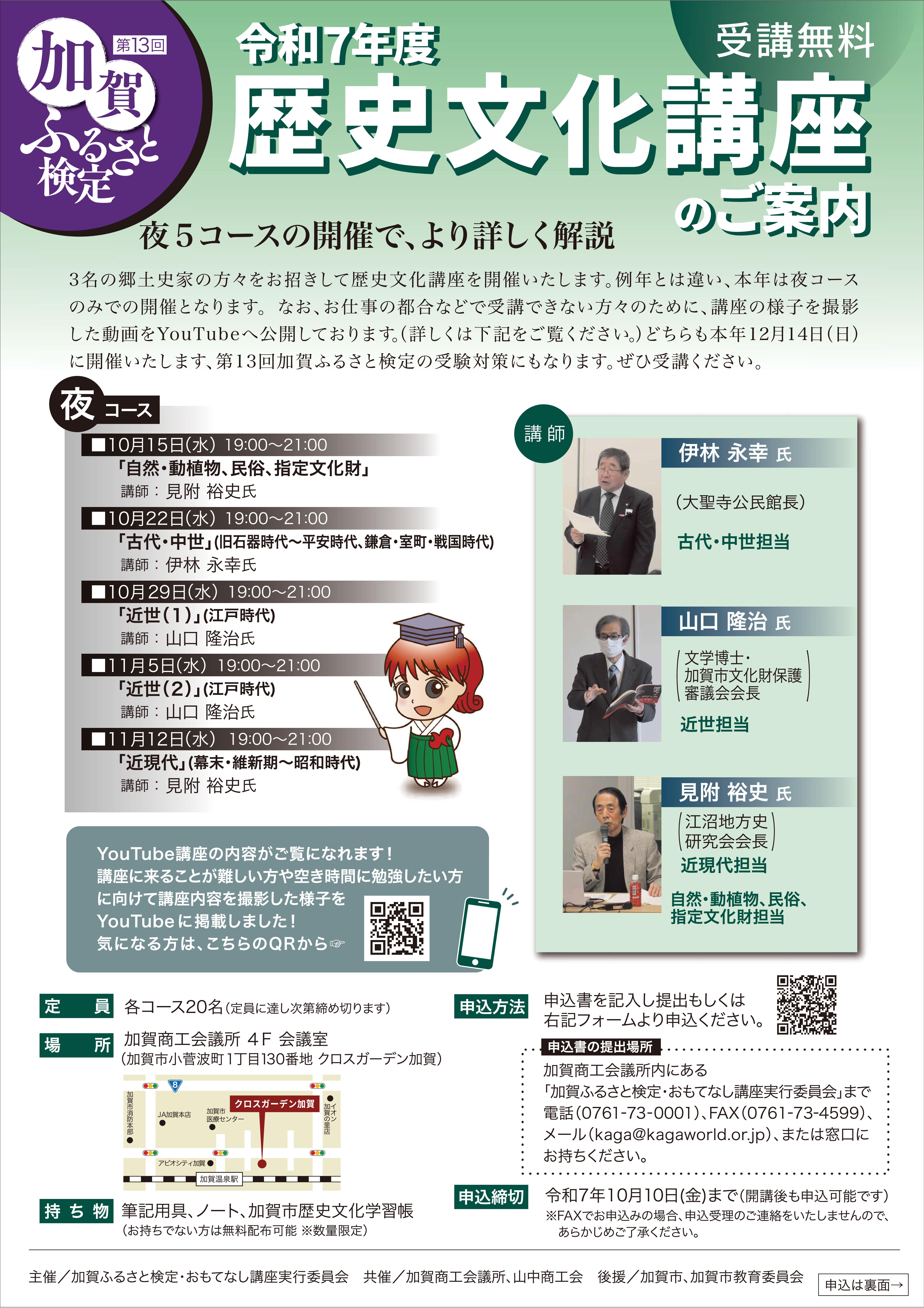 2025年10~11月にかけて5講座開講された「歴史文化講座」は、加賀ふるさと検定を受験する方に対して、問題作成を担当する講師陣が無料で「歴史文化学習帳」を元に解説する講座です。